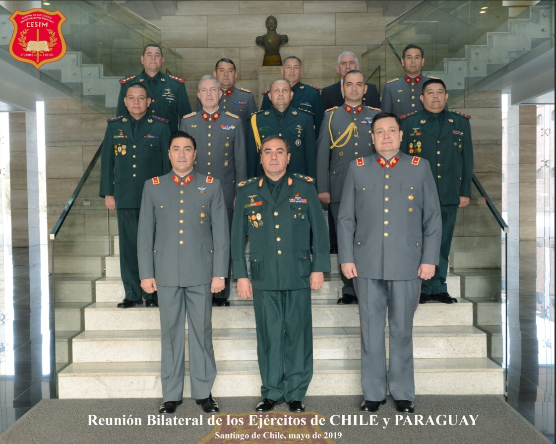 El lunes 27 de mayo se inauguró la reunión bilateral de Estado Mayor de los Ejércitos de Chile y Paraguay 2019, en el Edificio Ejército Bicentenario, la cual contó con la participación del Director del Centro de Estudios e Investigaciones Militares (CESIM) y Presidente de la reunión bilateral, GDB Rubén Segura F., y del GDB Odón Crispín Riquelme A., Comandante de la 4ta. División de Infantería del Ejército Paraguayo.